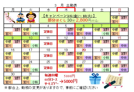 | 土曜日 | 中根、小林、宮野、宮川or 中井(土曜or日曜のどちらか) | |